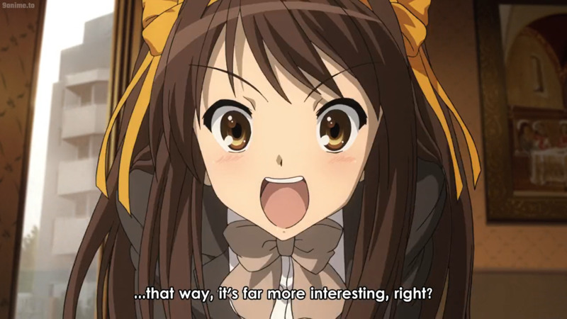 看完了经典的凉宫春日“漫无止境的八月”篇章,不说这8集怎么怎么样,至少漫无止境的感觉确实是完完整整体现给观众了,我前面几集还能完整地看,到后面实在是忍不了只能快进了。而且我看的时候不小心漏掉了第一集,所以相当于直接从第一万五千四百多次轮回开始,虽然后面补看了第一集(应该是轮回第一次),知道了不少细节,不过我觉得我看的这种顺序其实也不错。