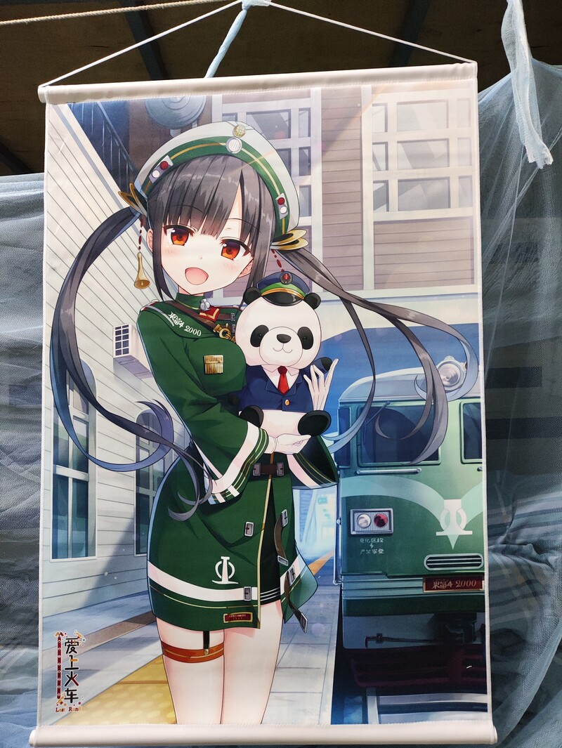 挂画原图是《爱上火车》出Last Run版本时的宣传图,原来是特典水晶立牌上面的插图,但后面也出成挂画了。西瓜应该可以说是《爱上火车》游戏里身材最好的铁路人偶,工作服也很能突出她曼妙的身体曲线,和后面硬朗的东风4B机车形成对比,非常好看。还有细双马尾和熊猫公仔,配合画师的可爱画风,非常萌萌哒。这幅挂画是B2大小的,细节非常清楚,当时我把挂画挂在宿舍床头,早上起床就能看到西瓜的笑脸,一下就感觉心旷神怡。从情绪价值来看我觉得是目前买的最值的挂画。