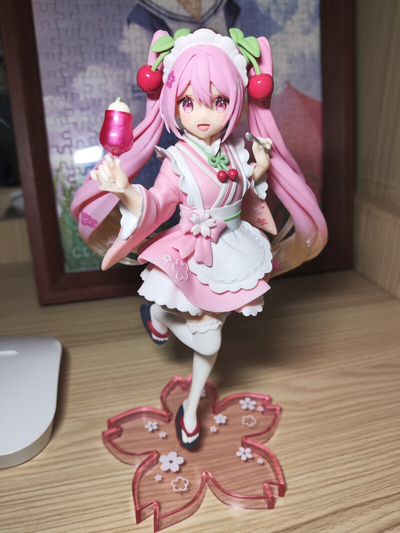 手办很可爱,下垂眼,多层超短裙,白丝袜,活泼的姿势,和粉色双马尾最搭了。