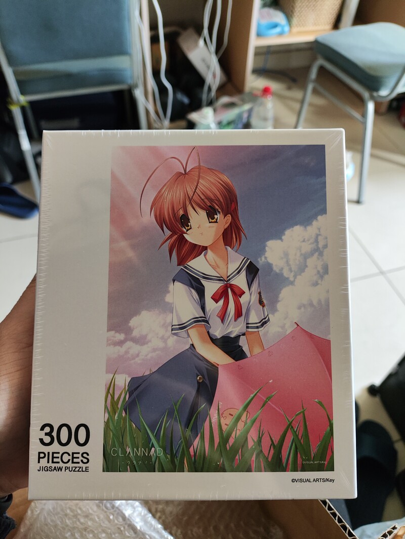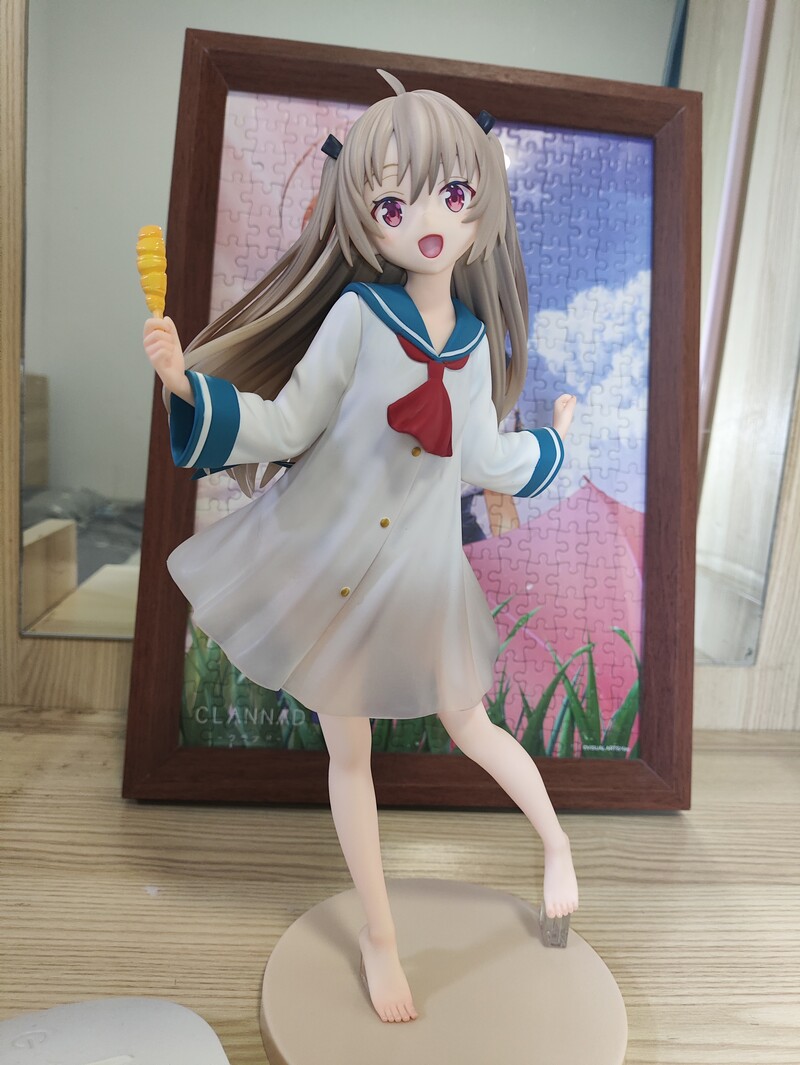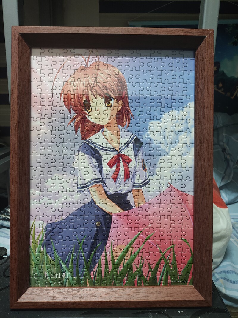 这幅拼图的原图不知道是哪里来的,画风挺好看的,五官、肩膀像是樋绘,但脸部比例、上色都比平常的樋绘好不少,如果真是樋上至画的,那可真是超水平发挥。雨后初晴,渚站在草地里放下小红伞,微笑着眺望远方,场景动作也很有诗意,我很喜欢。拼图有300片,我花了一个下午的时间把它拼好,还是挺简单的。我还买了个棕色相框(和渚的发色一致,比较相配),把拼好的拼图放在里面,方便观看。