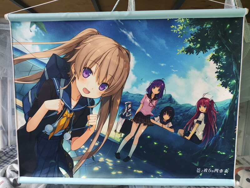 买了西瓜挂画以后,我就对挂画印象很好。因为我喜欢真白,所以也经常会去看真白的挂画。最后选定了淘宝商城上的一幅。这幅总体来说差强人意吧,主要当时的其他挂画要么穿和服不太好看,要么穿泳衣太暴露,要么是和莉佳一起或者是和其他三女主一起的。我这幅挂画虽然也有其他三个女主(甚至还带一个窗果),但真白占主要地位。缺点就是这幅挂画原图直接就是《苍彼Extra1》的标题界面背景,感觉有点廉价,而且画面也有些朴素。