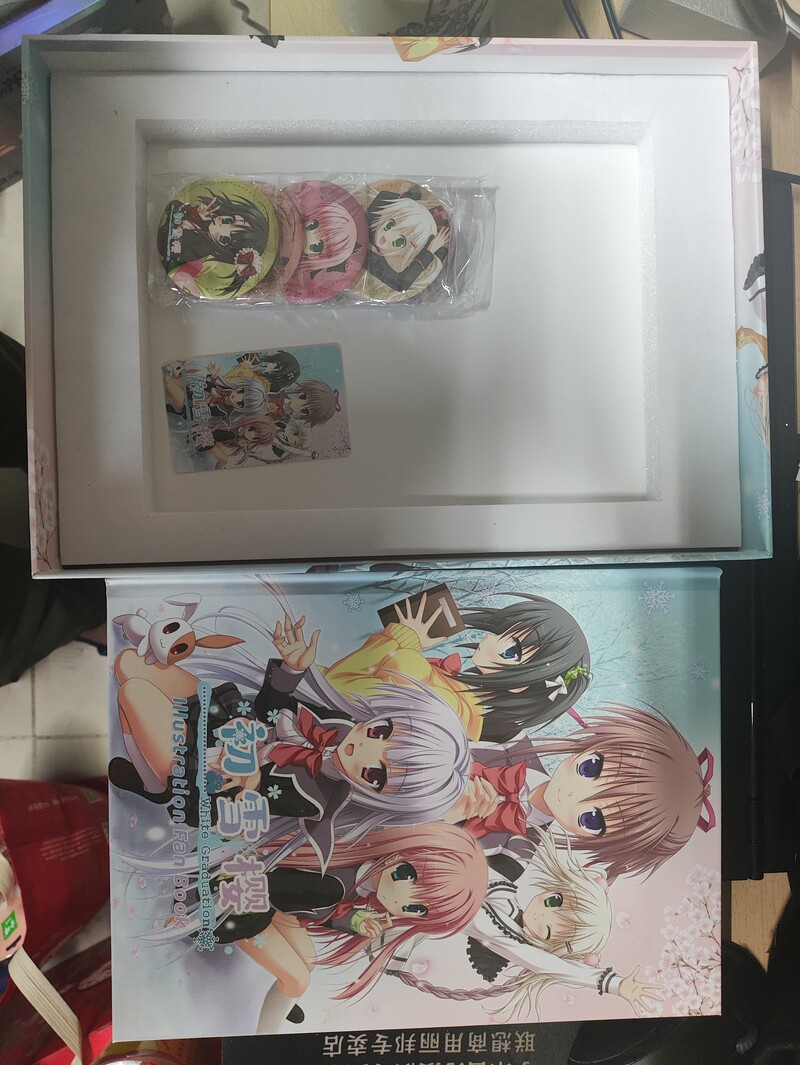 买了《苍彼》设定集以后,我就对设定集印象很好。后面刚好HikariField开始搞《初雪樱》众筹,我发现众筹349档特典套餐有送Illustration Book,还有各种周边,所以就买了。差不多半年以后才到货,看了下感觉挺不值的,游戏包装盒就不说了,可能有人喜欢收藏这些。Illustration Book挺垃圾的,就放了些游戏CG,我前面说过了,这会让我感觉很廉价。毕竟GarBro解包游戏又不难,有了解包出来的高分辨率CG,这种东西我想印多少就印多少,设定集不就是图那些平常看不到的插画和情报吗?