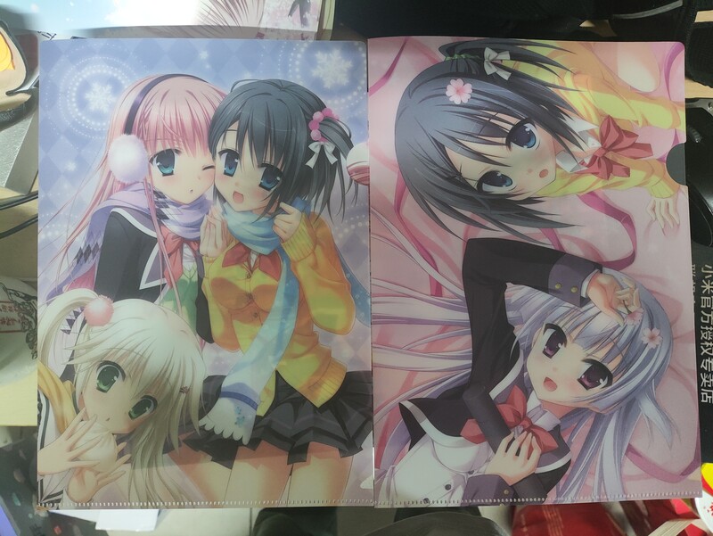 剩下的,徽章时尚小垃圾不值一提。“海报”其实就是几张小纸片不值一提。签名板(色纸)倒还可以,是画师为了众筹现画的,我选的是婚纱白熊,两个包子头很可爱,不过总觉得很像《金恋》里的米娜。签名板不太好挂,本来像买个亚克力相框装潢一下的,但这个大小的相框也不便宜,所以暂时先不挂了。还有两个文件袋,插画原图确实不是游戏CG,但这算“痛袋”了吧,实在不太好意思拿出来用。