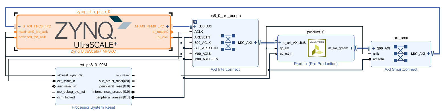 继续按照前面的步骤生成IP核、创建Block Design,这时会发现product核的右侧多了一个m_axi_gmem的端口,需要经过总线连到DRAM。首先需要给ZYNQ核添加DRAM端口,办法是双击Zynq核对IP进行定制,在对话框左侧选择PS-PL Configuration,右边依次展开PS-PL Interfaces、Slave Interfaces、AXI HP,勾选AXI HPC0 FPD,然后点OK。这时会发现ZYNQ核多了一个S_AXI_HPC0_FPD端口(和一个时钟端口),再点Run Connection Automation,就可以自动连接了: